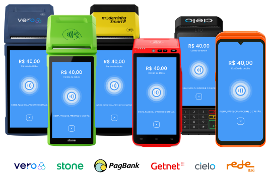 • Maquininhas de cartão de crédito: Cielo, Getnet, PagSeguro e Stone. Consulte modelos.
